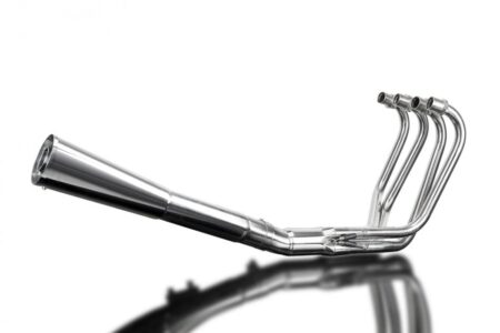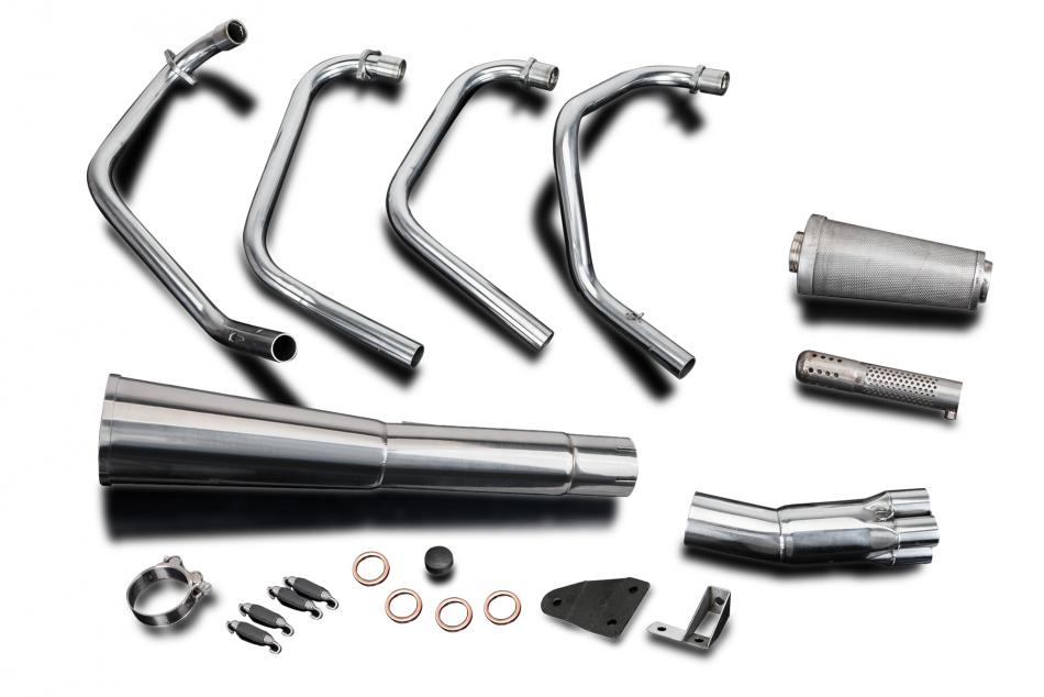 With stainless downpipes and the Delkevic classic Megaphone muffler. This system is hand crafted from premium quality materials throughout, and designed to suit the classic bikes of yesteryear. Incorporating a 3 stage cartridge baffle system, you tune the tone of the exhaust to suit you.